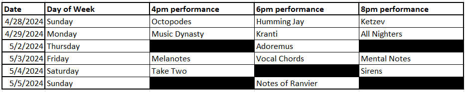 In case these outs don’t work for you (and in case any acapella doers are reading this and considering rising against us unless we appease them), here’s the schedule for spring concerts this year. Who knows, maybe they’ll actually be good.